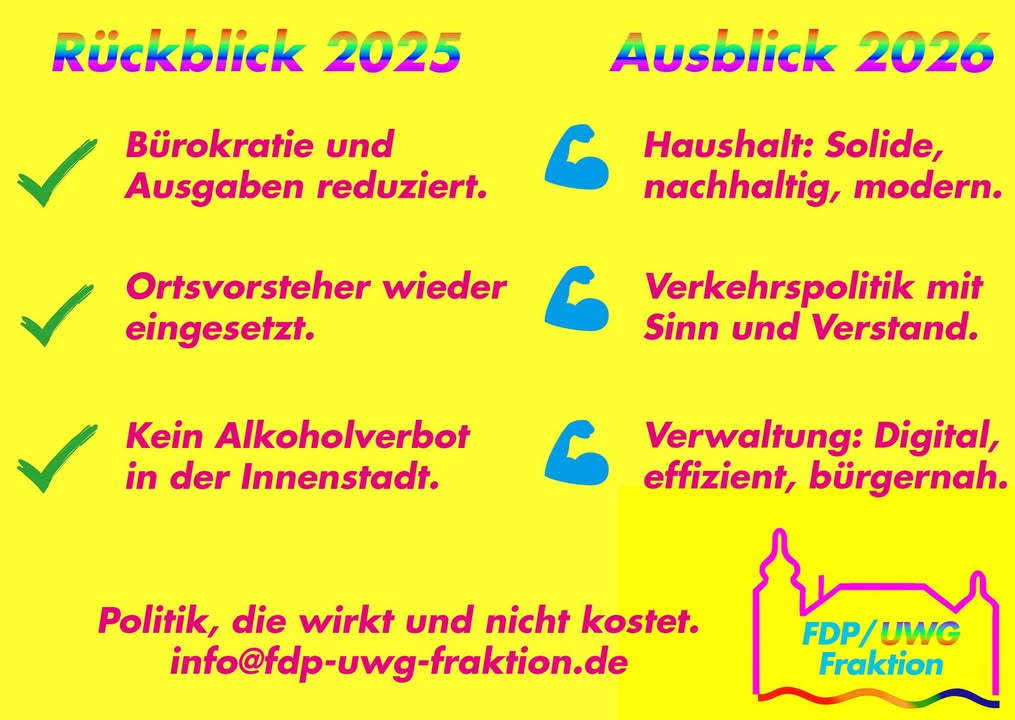 In der neuen Ratsperiode konnten wir bereits erste Punkte unseres Programms umsetzen💪 Die größte Herausforderung im neuen Jahr: der Haushalt💰. Während Berlin Luftschlösser auf Schulden baut, setzen wir auf solide, nachhaltige Finanzen, die euch nicht belasten.